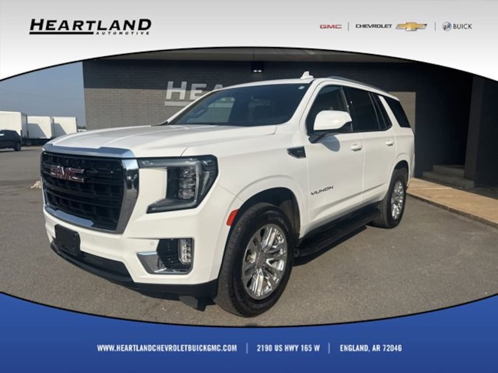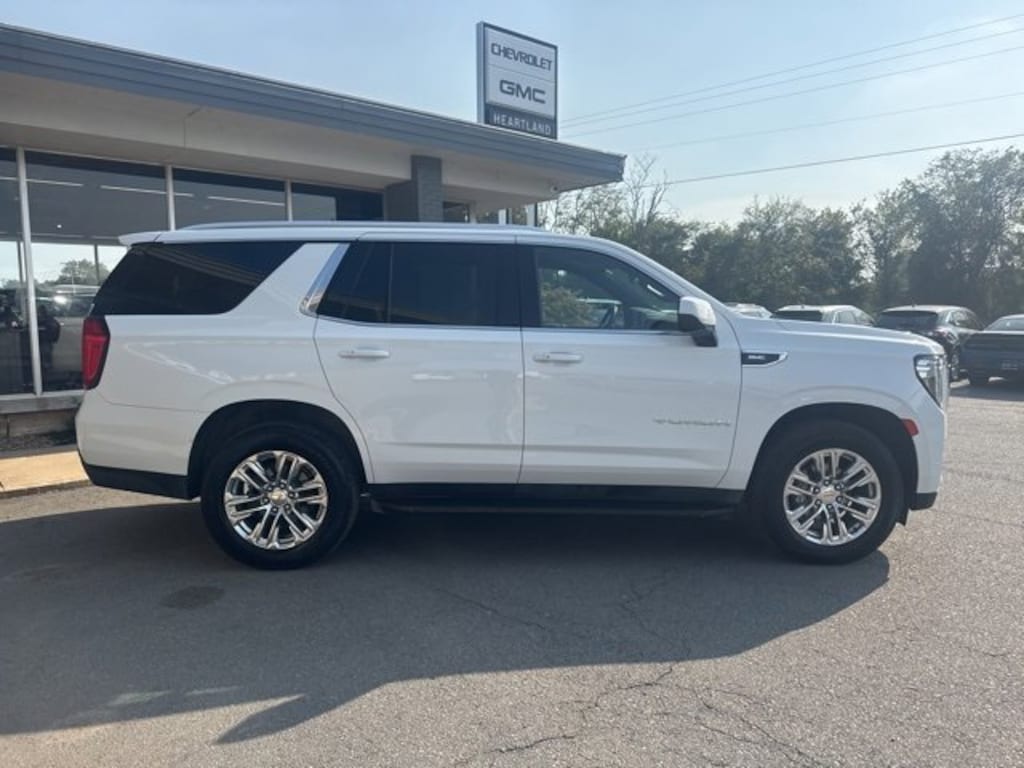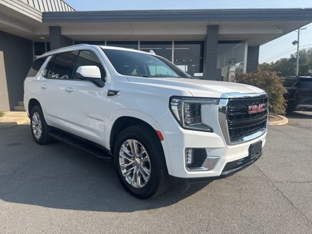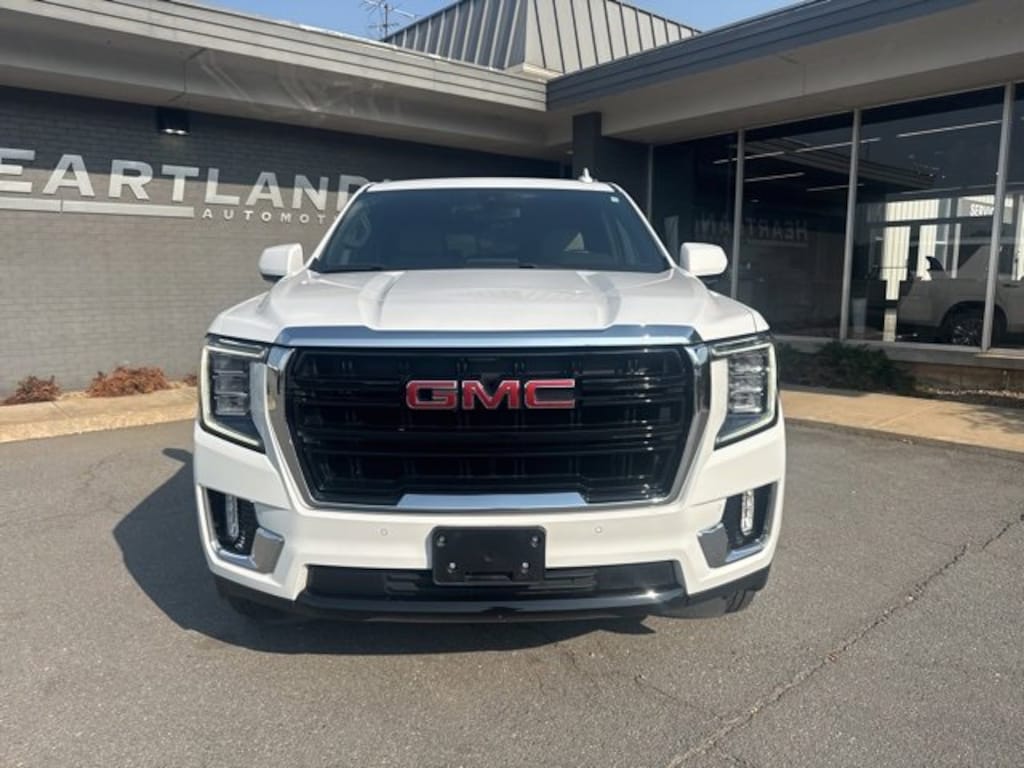 This 2022 GMC Yukon SLE in Summit White comes with the following features: EcoTec3 5.3L V8 10-Speed Automatic with Overdrive 4WD License Plate Front Mounting Package, Preferred Equipment Group 3SA (Automatic Stop/Start and Start/Stop System Disable Button), 4WD, 3.23 Rear Axle Ratio, 3rd row seats: split-bench, 4-Wheel Disc Brakes, 6 Speakers, 6-Speaker Audio System Feature, ABS brakes, Air Conditioning, Alloy wheels, AM/FM radio: SiriusXM with 360L, AM/FM Stereo, Apple CarPlay/Android Auto, Auto High-beam Headlights, Automatic temperature control, Brake assist, Bumpers: body-color, Cloth Seat Trim, Compass, Delay-off headlights, Driver door bin, Driver vanity mirror, Dual front impact airbags, Dual front side impact airbags, Electronic Stability Control, Emergency communication system: OnStar and GMC Connected Services capable, Four wheel independent suspension, Front anti-roll bar, Front Bucket Seats, Front Center Armrest, Front dual zone A/C, Front fog lights, Front reading lights, Fully automatic headlights, Heated door mirrors, Illuminated entry, Lane Departure Warning System, Leather steering wheel, Low tire pressure warning, Navigation System, Not Equipped w/Front & Rear Park Assist, Not Equipped w/Steering Column Lock, Occupant sensing airbag, Outside temperature display, Overhead airbag, Overhead console, Panic alarm, Passenger door bin, Passenger vanity mirror, Power door mirrors, Power driver seat, Power passenger seat, Power steering, Power windows, Premium Smooth Ride Suspension, Rain sensing wipers, Rear air conditioning, Rear anti-roll bar, Rear reading lights, Rear seat center armrest, Rear window defroster, Rear window wiper, Remote keyless entry, Roof rack: rails only, Security system, SiriusXM w/360L, Speed control, Speed-sensing steering, Split folding rear seat, Spoiler, Steering wheel mounted audio controls, Tachometer, Telescoping steering wheel, Tilt steering wheel, Traction control, Trip computer, Variably intermittent wipers, Voltmeter, Wheels: 18 x 8.5 6-Spoke Machined Aluminum, and Wheels: 20 x 9 6-Spoke Polished Aluminum.