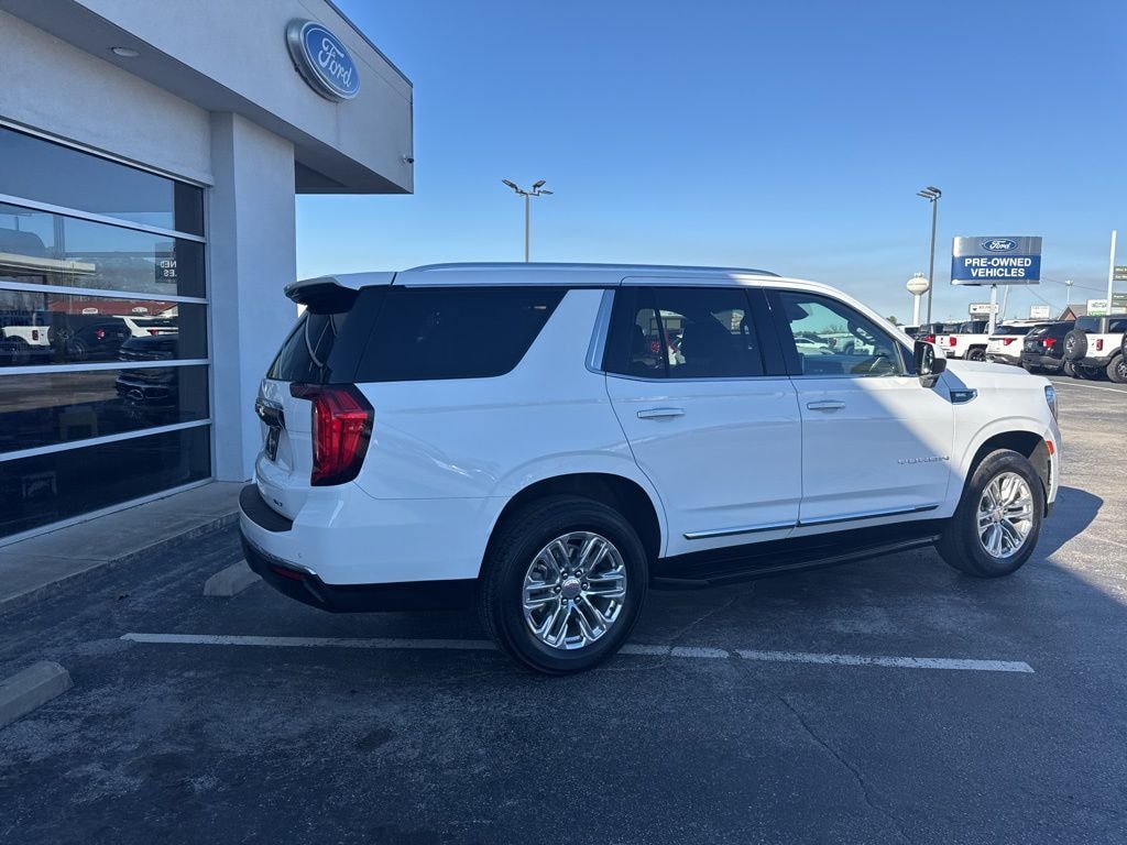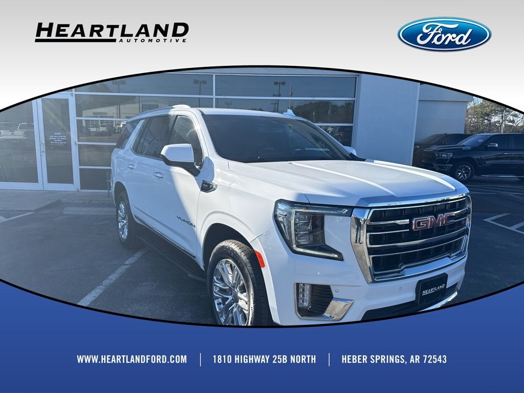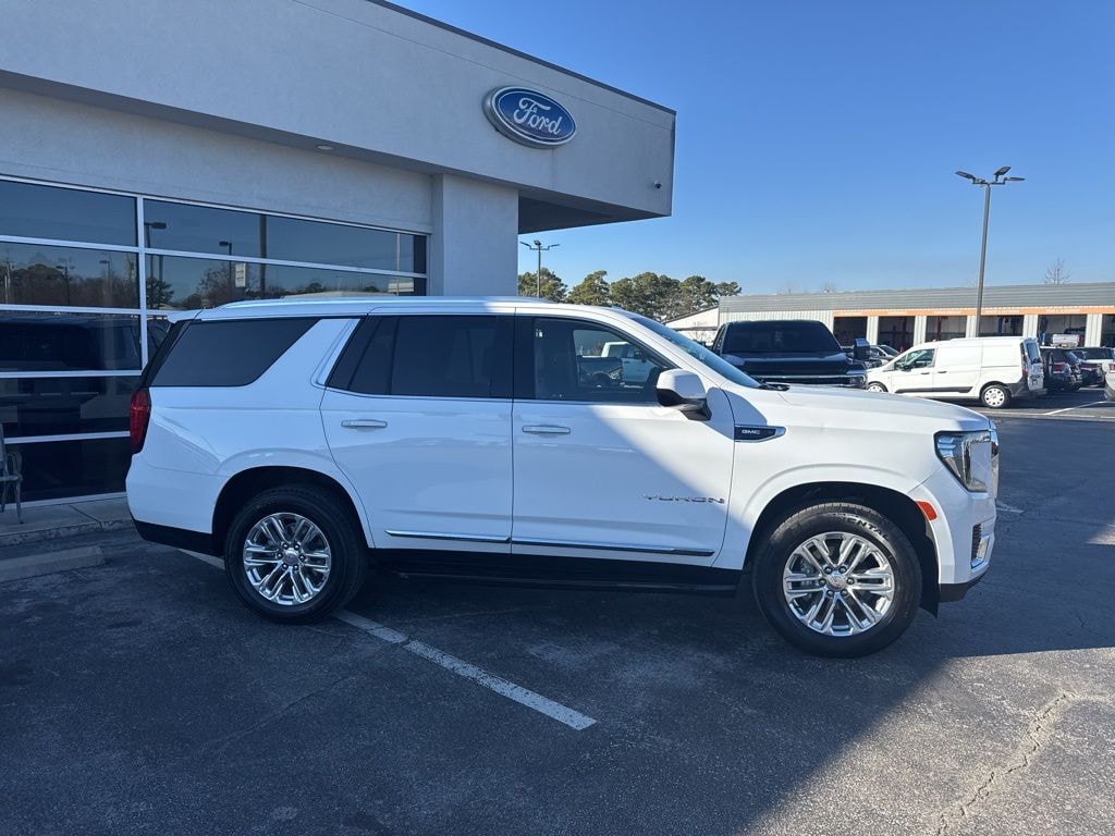 This 2024 GMC Yukon SLT in Summit White comes with the following features: EcoTec3 5.3L V8 10-Speed Automatic with Overdrive RWD License Plate Front Mounting Package, Preferred Equipment Group 4SA (12-Way Power Seat Adjusters, 2 Presets For Power Driver Seat, Bose 9-Speaker Stereo Audio System Feature, Bright Chrome Bodyside Moldings, Bright Front & Rear Door Sill Plates, Chrome Door Handles w/Body-Color Strip, Hands-Free Power Programmable Rear Liftgate, Heated Driver & Front Passenger Seats, Inside Rear-View Auto-Dimming Mirror, Perforated Heated & Ventilated Dr & Frt Pass Seats, Safety Alert Seat, Universal Home Remote, and Wireless Charging), 3.23 Rear Axle Ratio, 3rd row seats: split-bench, 4-Wheel Disc Brakes, 9 Speakers, ABS brakes, Air Conditioning, Alloy wheels, AM/FM radio: SiriusXM with 360L, AM/FM Stereo, Apple CarPlay/Android Auto, Auto High-beam Headlights, Auto-dimming Rear-View mirror, Automatic Emergency Braking, Automatic temperature control, Bodyside moldings, Brake assist, Bumpers: body-color, Compass, Delay-off headlights, Deleted 3 Years of OnStar Remote Access, Driver door bin, Driver vanity mirror, Dual front impact airbags, Dual front side impact airbags, Electronic Stability Control, Emergency communication system: OnStar and GMC connected services capable, Following Distance Indicator, Forward Collision Alert, Four wheel independent suspension, Front & Rear Park Assist, Front anti-roll bar, Front Bucket Seats, Front Center Armrest, Front dual zone A/C, Front fog lights, Front Pedestrian Braking, Front reading lights, Fully automatic headlights, Garage door transmitter, Heated door mirrors, Heated front seats, Illuminated entry, IntelliBeam Automatic High Beam On/Off, Lane Change Alert w/Side Blind Zone Alert, Lane Keep Assist w/Lane Departure Warning, Low tire pressure warning, Memory seat, Navigation System, Occupant sensing airbag, Outside temperature display, Overhead airbag, Overhead console, Panic alarm, Passenger door bin, Passenger vanity mirror, Perforated Leather-Appointed Seating, Power door mirrors, Power driver seat, Power Liftgate, Power passenger seat, Power steering, Power windows, Premium Smooth Ride Suspension, Rain sensing wipers, Rear air conditioning, Rear anti-roll bar, Rear Cross Traffic Alert, Rear reading lights, Rear seat center armrest, Rear window defroster, Rear window wiper, Remote keyless entry, Roof rack: rails only, Security system, SiriusXM w/360L, Speed control, Speed-sensing steering, Split folding rear seat, Spoiler, Steering wheel mounted audio controls, Tachometer, Telescoping steering wheel, Tilt steering wheel, Traction control, Trip computer, Variably intermittent wipers, Ventilated front seats, Voltmeter, and Wheels: 20" x 9" 6-Spoke Polished Aluminum.