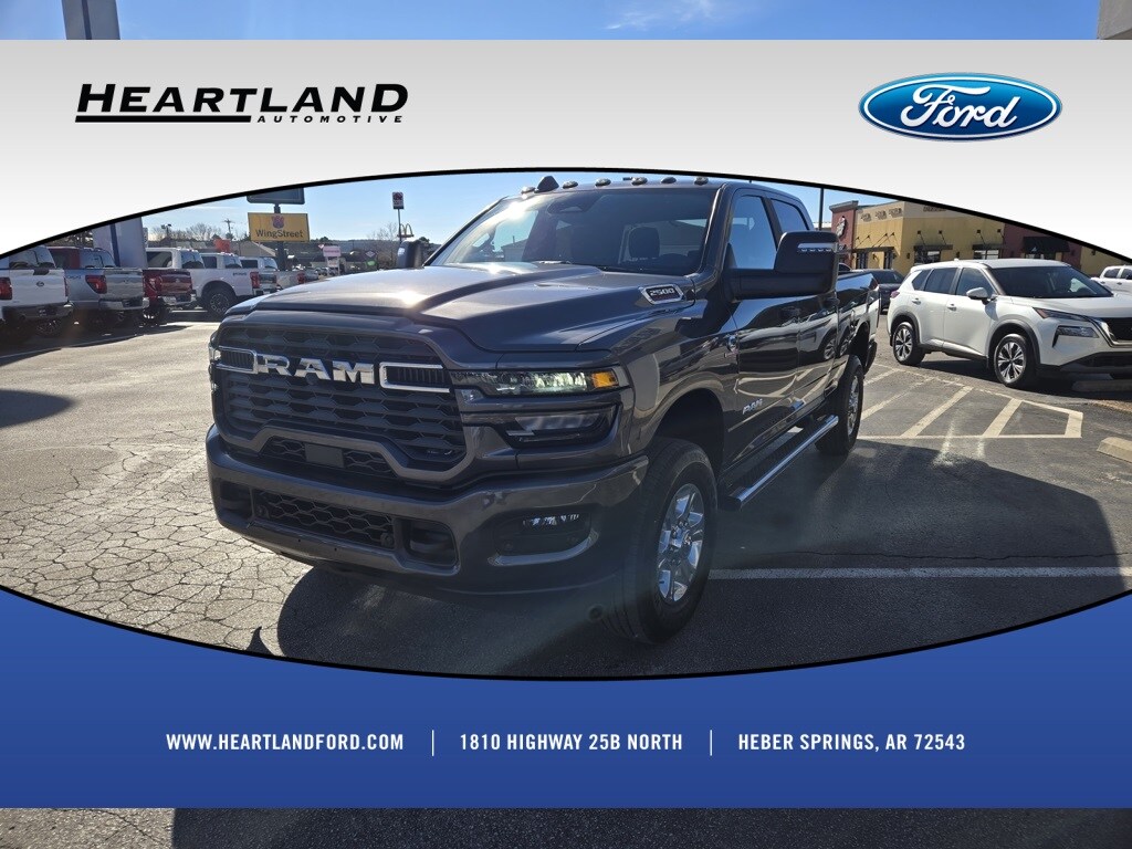 This 2025 Ram 2500 Big Horn in Granite Crystal Metallic Clearcoat comes with the following features: 6.7L I6 8-Speed Automatic 4WD Big Horn Level 1 Plus Equipment Group (12" Touchscreen Display, 2 Way Rear Headrest Seat, 2nd Row In Floor Storage Bins, 4 Way Front Headrests, 40/20/40 Split Bench Seat, 4G LTE Wi-Fi Hot Spot, 9 Alpine Speakers w/Subwoofer, Air Conditioning ATC w/Dual Zone Control, Alexa Built-In, Anti-Spin Differential Rear Axle, Apple CarPlay, Auto Power-Folding Mirrors, Auto-Dimming Rear-View Mirror, Black Exterior Mirrors, Connected Travel & Traffic Services, Connectivity - US/Canada, Dual Glove Boxes, Emergency Vehicle Alert System (EVAS), Exterior Mirrors Courtesy Lamps, Exterior Mirrors w/Heating Element, Exterior Mirrors w/Supplemental Signals, Foam Bottle Insert (Door Trim Panel), Folding Flat Load Floor Storage, Footwell Courtesy Lamp, Forward & Reverse Utility Lights, Front Armrest w/Cupholders, Front Center Seat Cushion Storage, Front Seat Back Map Pockets, Global Telematics Box Module (TBM), Glove Box Lamp, Google Android Auto, GPS Antenna Input, GPS Navigation, HD Radio, Integrated Voice Command w/Bluetooth, LED Bed Lighting, Locking Lower Glove Box, Luxury Steering Wheel, Manual Adjust 4-Way Front Passenger Seat, Mirror Running Lights, MOPAR Deployable Bed Step, MOPAR Spray In Bedliner, Off-Road Info Pages, Power 2-Way Driver Lumbar Adjust, Power Adjust 8-Way Driver Seat, Power Adjust Mirrors, Power Adjustable Convex Aux Mirrors, Power Heated Folding Telescopic Mirrors, Power Telescoping Mirrors, Premium Cloth 40/20/40 Bench Seat, Radio: Uconnect 5 Nav w/12.0" Display, Rear 60/40 Folding Seat, Rear Dome w/On/Off Switch Lamp, Remote Start System, Remote USB Port - Charge Only, Selectable Tire Fill Alert, SiriusXM Radio Service, SiriusXM w/360L, Steering Wheel Mounted Audio Controls, Storage Tray, and Trailer Tow Pages), Cold Weather Group (Engine Block Heater and MOPAR Winter Front Grille Cover), Quick Order Package 24Z Big Horn, Sport Appearance Package (Black Interior Accents, Body Color Grille Surround, Painted Front Bumper, Painted Rear Bumper, and Sport Decal), 4-Wheel Disc Brakes, 5th Wheel/Gooseneck Towing Prep Group, 6 Speakers, ABS brakes, Air Conditioning, Alloy wheels, AM/FM radio: SiriusXM, Apple CarPlay/Android Auto, Brake assist, Bumpers: chrome, Clearance Lamps, Cloth 40/20/40 Bench Seat, Compass, Delay-off headlights, Driver door bin, Dual front impact airbags, Dual front side impact airbags, Electronic Stability Control, Front anti-roll bar, Front Center Armrest w/Storage, Front fog lights, Front License Plate Bracket, Front reading lights, Fully automatic headlights, Heated door mirrors, Illuminated entry, Low tire pressure warning, Manual Adjust 4-Way Driver Seat, MOPAR Front & Rear Rubber Floor Mats, Occupant sensing airbag, Outside temperature display, Overhead airbag, Overhead console, Panic alarm, ParkView Rear Back-Up Camera, Passenger door bin, Passenger vanity mirror, Power door mirrors, Power steering, Power windows, Radio data system, Radio: Uconnect 5 w/8.4" Display, Rear anti-roll bar, Rear Folding Seat, Rear seat center armrest, Rear step bumper, Rear window defroster, Remote keyless entry, Security system, Speed control, Tachometer, Tilt steering wheel, Traction control, Trip computer, Turn signal indicator mirrors, Variably intermittent wipers, Vinyl 2nd Row Seat, Voltmeter, and Wheels: 18" x 8.0" Polished Aluminum.